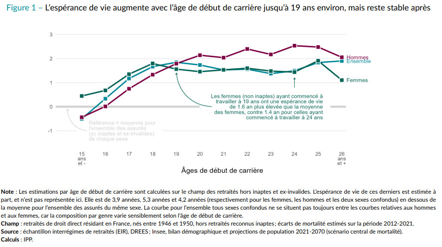 Étonnamment, en revanche, les écarts d’espérance de vie selon l’âge auquel les divers assurés atteignent le taux plein n’avaient jamais été estimés jusqu’à aujourd’hui. Deux nouvelles publications, un Dossier de la DREES et une note de l’IPP, apportent des réponses nouvelles à ce sujet. Elles montrent que, si les assurés (non reconnus inaptes) ayant commencé à travailler très tôt (avant 18 ans pour les femmes, avant 20 ans pour les hommes) ont bien une espérance de vie plus faible, il n’y a guère de différences après.