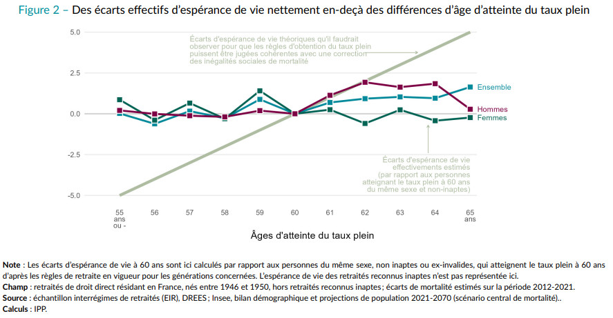 Conséquence : la durée (espérée) de retraite est toujours plus longue pour les personnes qui atteignent le taux plein le plus tôt, hommes comme femmes. Cela reste vrai si on prend en compte, par exemple, la durée de retraite sans perte d’autonomie.