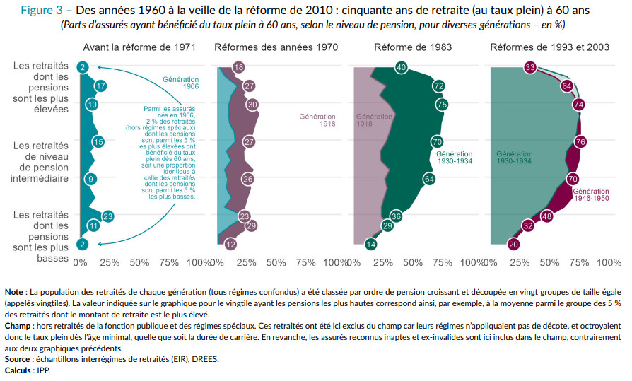 Mais cette hypothèse a-t-elle été vérifiée ? Jusqu’à récemment, les études sur la mortalité se concentraient sur des critères comme le revenu, le diplôme ou la catégorie socioprofessionnelle. Or ces variables ne reflètent qu’imparfaitement l’âge d’atteinte du taux plein. On le voit bien en regardant par exemple qui sont les personnes qui ont, historiquement, le plus bénéficié de la retraite au taux plein à 60 ans. C’est entre le niveau médian et le seuil des 20 % les plus aisés que la part de bénéficiaires est la plus haute, et ces 20 % les plus aisés en ont bénéficié plus souvent que les 20 % à plus faible pension.