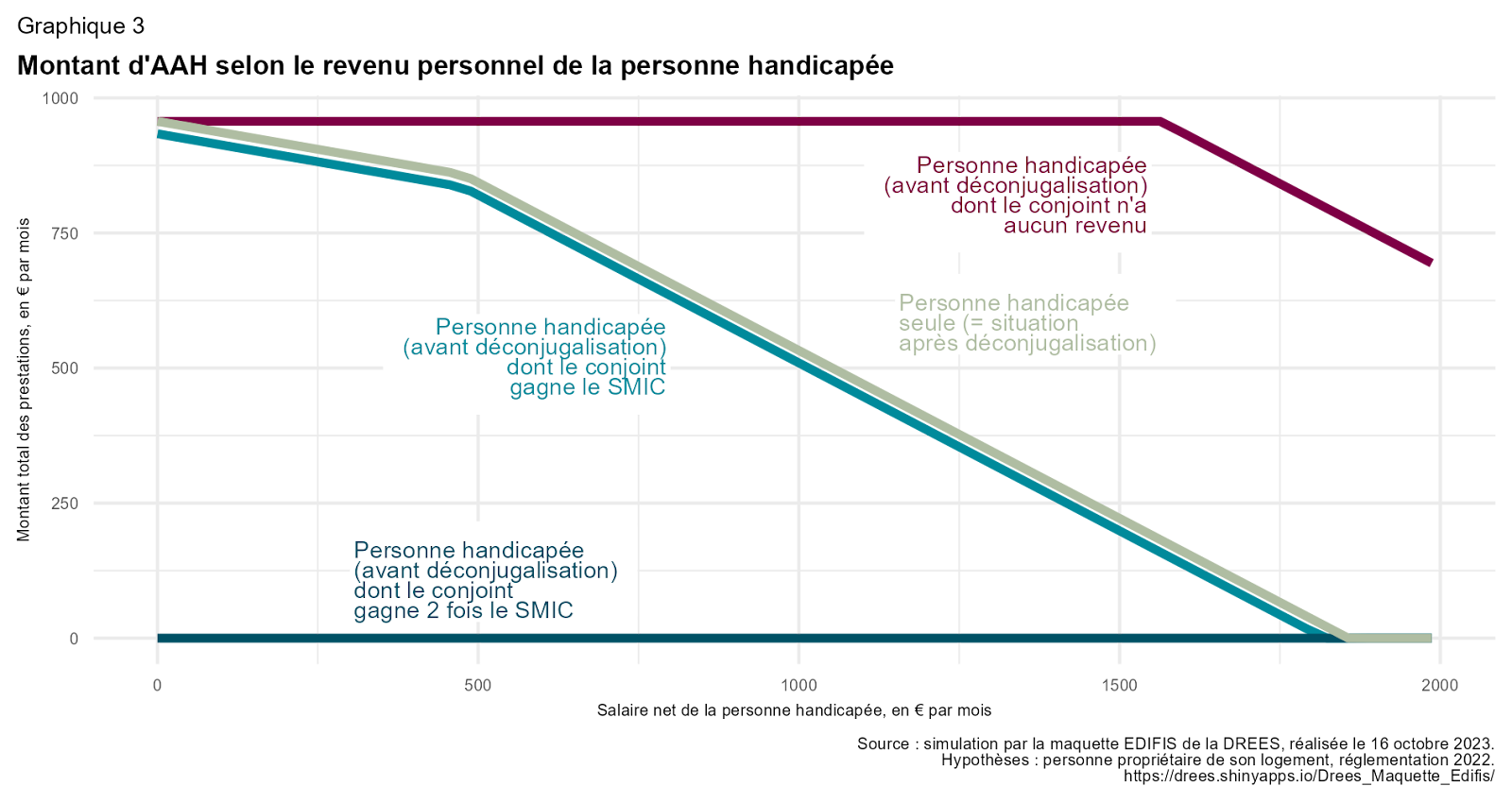Une personne handicapée dont le conjoint gagnait deux fois le SMIC ne percevait par l’AAH avant sa déconjugalisation, quel qu’était son revenu personnel (courbe bleue foncé sur le graphique). Avec la déconjugalisation (courbe grise), elle perçoit un montant d’aide qui peut aller jusqu’au montant maximal de l’allocation, soit un peu moins 1 000 euros par mois : il s’agit de la situation qui « gagne le plus » parmi celles représentées sur le graphique. Une personne dont le conjoint gagne le SMIC (courbe bleue clair sur le graphique) voit aussi son montant d’aide augmenter avec la déconjugalisation, mais de façon beaucoup plus modérée (écart entre la courbe bleue clair et la courbe grise), car les divers abattements pris en compte dans le calcul faisaient déjà que le montant d’aide était proche de sa valeur maximale. Enfin, et à l’inverse, la personne handicapée dont le conjoint est sans revenu bénéficiait avant la déconjugalisation de l’AAH, quel que soit son revenu personnel, d’un montant total d’aide supérieur à celui d’une personne seule (courbe rouge foncé) : elle voit donc ce montant diminuer si on arrête de prendre en compte son conjoint et qu’on lui applique des modalités de calcul analogues à celles d’un bénéficiaire vivant seul. Si, par exemple, ses revenus personnels sont de 1 000 euros par mois, son montant d’AAH est d’un peu plus de 950 euros par mois avec le calcul conjugalisé, contre un peu plus de 500 euros avec le calcul déconjugalisé.