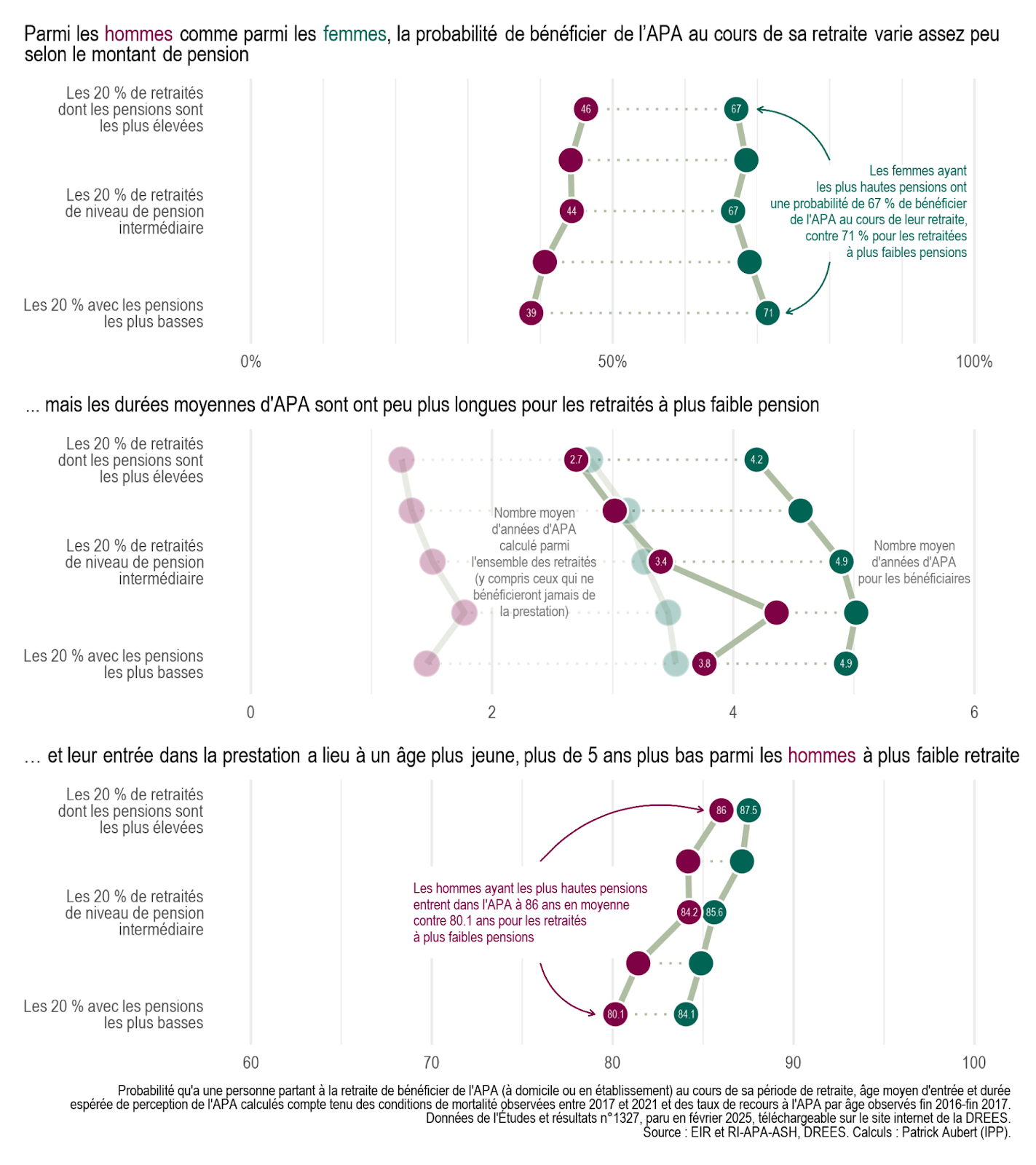 Par ailleurs, si la probabilité de recourir aux aides à l’autonomie au cours de la période de retraite est relativement proche pour les plus aisés et les plus démunis, la durée de perception est un peu plus courte pour les premiers. Les retraités les plus aisés, hommes comme femmes, commencent en effet à percevoir l’APA à un âge en moyenne 3 à 6 ans plus élevé que ceux à plus faible pension.