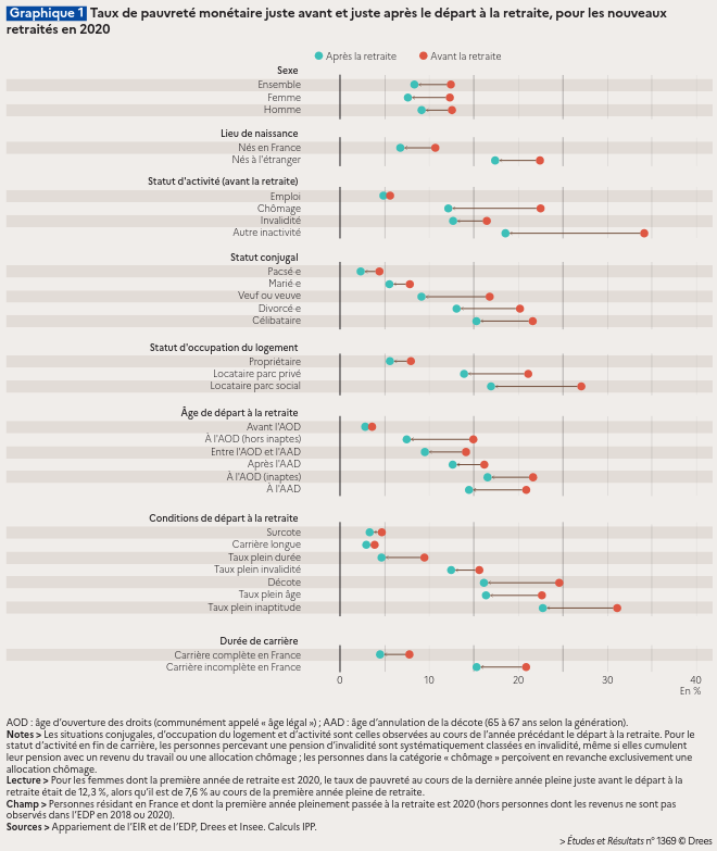 Par exemple, la baisse du taux de pauvreté est d’ampleur similaire pour les nouveaux retraités ayant atteint le taux plein au titre d’une durée de carrière suffisante et pour ceux qui l’ont atteint en partant à l’âge d’annulation de la décote (respectivement 4,8 points et 6,3 points), alors même que les premiers avaient, avant le départ à la retraite, un taux de pauvreté de 13 points inférieurs à celui des seconds. L’écart reste donc quasiment aussi grand une fois à la retraite.