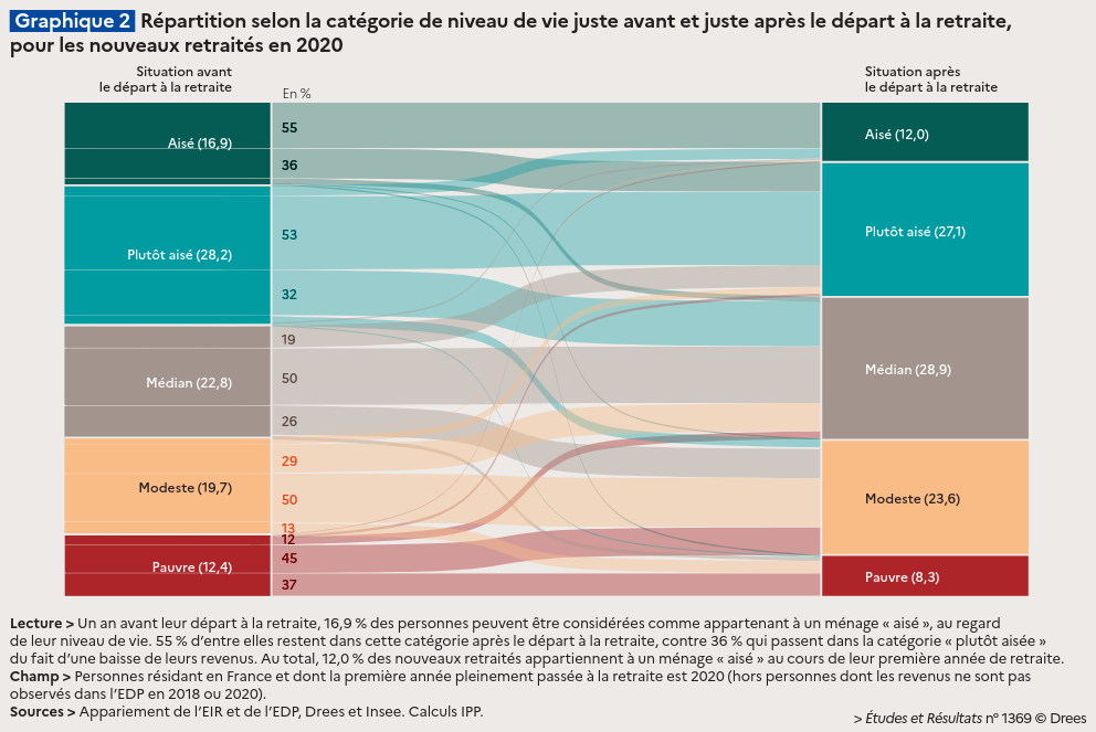 Globalement, si le départ à la retraite permet bien de réduire les inégalités de revenus entre les personnes par rapport à la situation en toute fin de vie active, cette réduction reste d’ampleur modérée, et le départ ne modifie que peu la position des personnes dans l’échelle des niveaux de vie. La proportion de personnes pauvres diminue certes de 4,1 points de pourcentage, mais celle de personnes modestes, c’est-à-dire dont le niveau de vie se situe entre 60 % et 90 % du niveau de vie médian, augmente dans une proportion similaire (+3,9 points). Symétriquement, la proportion de personnes considérées comme aisées ou plutôt aisées au regard de leur niveau de vie diminue, au profit de celles avec un niveau de vie médian, mais cette baisse est modérée, de l’ordre de 6 points de pourcentage.