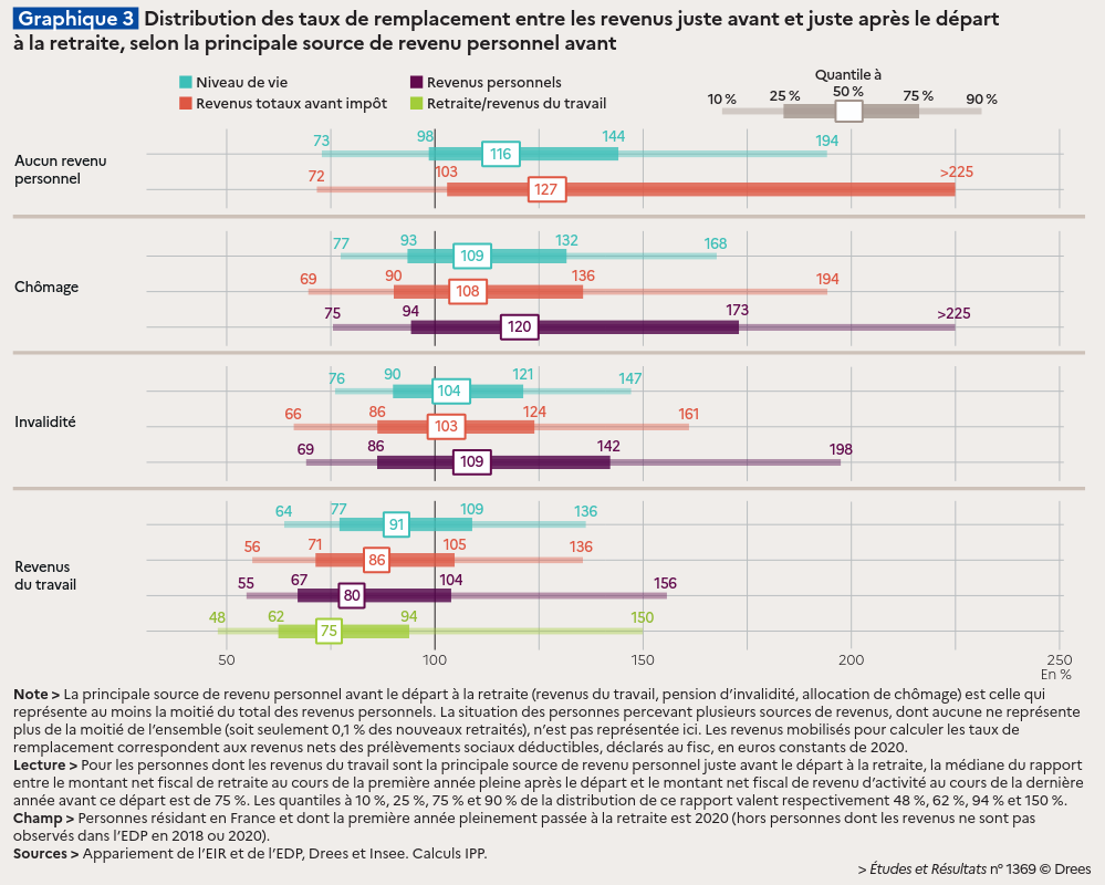 Pour la moitié des personnes encore en emploi avant la retraite, le montant de pension est inférieur de plus de 25 % au dernier revenu d’activité (variation dite médiane). Toutefois, la baisse apparaît atténuée si l’on considère l’ensemble des revenus avant impôt du ménage de la personne nouvellement retraitée (baisse médiane de 14 %), et plus encore si l’on considère le niveau de vie (baisse médiane de 9 %). Un peu plus d’un tiers (35 %) des personnes en emploi juste avant la retraite voient même leur niveau de vie augmenter à la retraite. La majorité des personnes sorties précocement de l’emploi voient à la fois leur revenu personnel et leur niveau de vie augmenter après le départ à la retraite. L’augmentation médiane du niveau de vie est ainsi de 9 % parmi les personnes qui étaient au chômage avant la retraite et de 4 % pour celles qui étaient en invalidité.